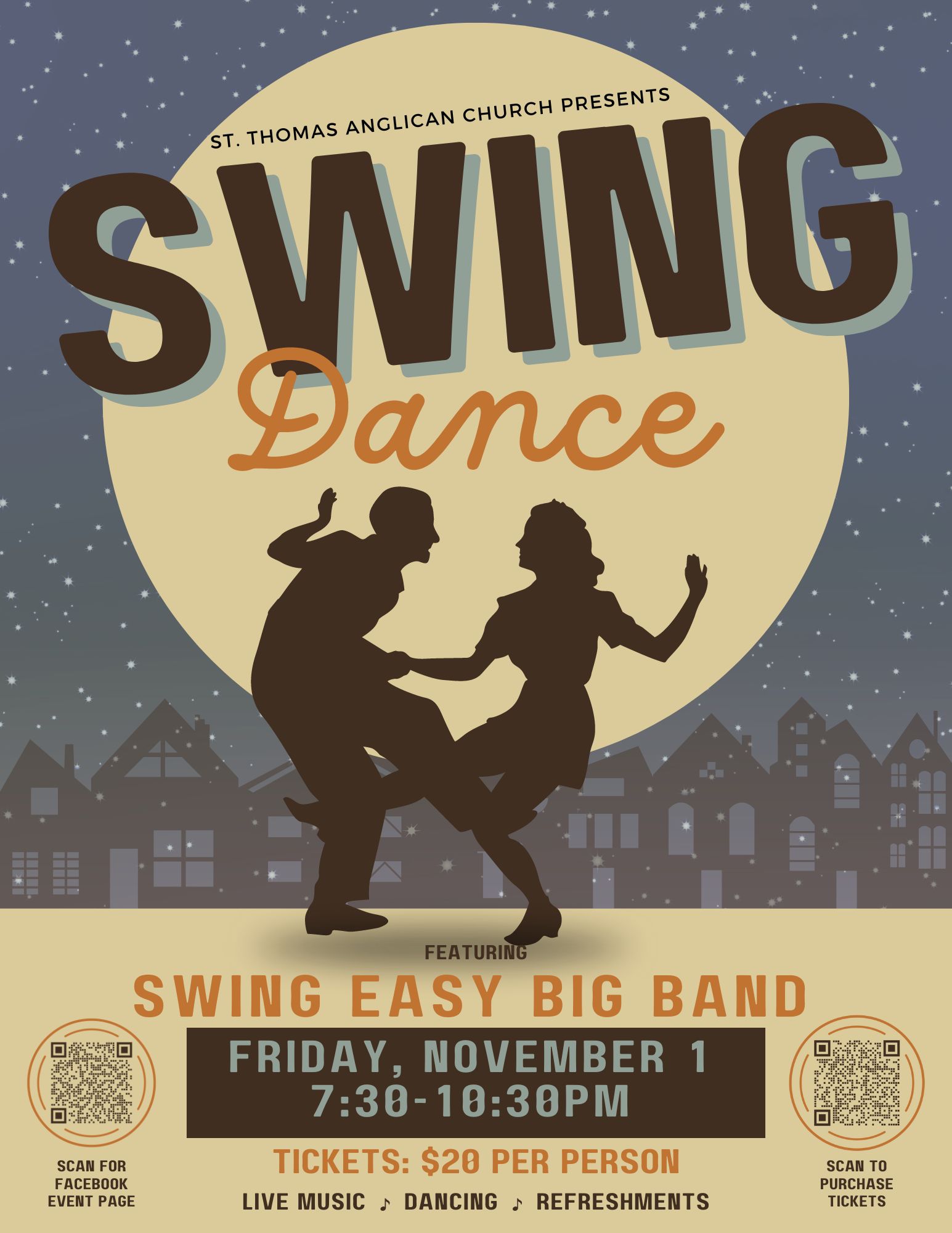 Get ready to swing into a night of fun! Join us for the St. Thomas Anglican Church's Swing Dance event on Friday, November 1st at 7:30 PM. Enjoy live music from the incredible "Swing Easy Big Band" and delicious refreshments!